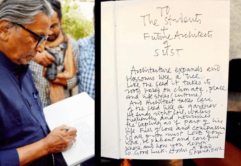 Though-out his eventful life, Doshi has donned many hats and won many titles. As an alumni and an educator, Ar. Athulya Aby, the writer for the firm, is most indebted to Professor Doshi for founding the School of Architecture at Ahmedabad, and nurturing it to grow into the present CEPT University. Conceptualised as an open campus with flexible studios, it was the initiator of a pedagogical shift in architectural education – rethinking how we teach, learn, design and talk about spaces. | | There is only one form of good luck in life and that is to have good teachers! Good teachers inspire us! All of us who knew Doshi share the smile of good luck. – Christopher Benninger